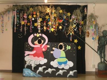 昨年度末のおひな様に続き、今回も、おりひめとひこぼしに子どもたちが顔を入れて楽しめます。