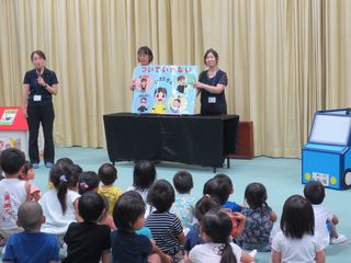 大型絵本や車の模型を使って、自分の心と体を自分で守る方法「3つの約束」を教えていただきました。