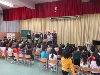 お楽しみコーナーでは、 「十 二支の話」の劇を観ました。先生方が十二支の動物に扮して登場すると、子供たちは大喜びでした。